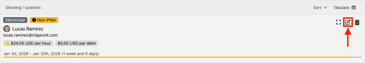 To edit a position, navigate to the "Positions" tab (explained above here) and click the pencil icon on the right hand side of the position (indicated by the red box and arrow in the image below).