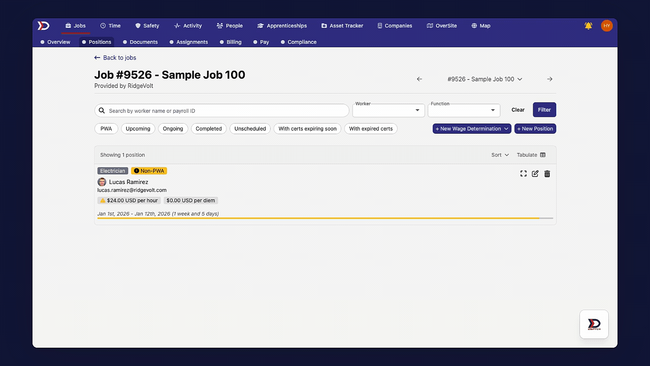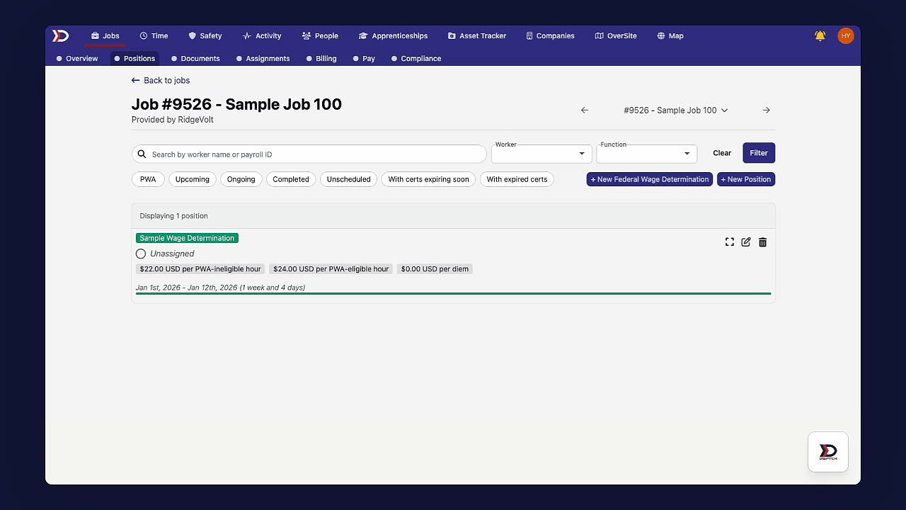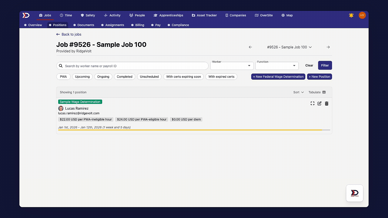 Positions are how users are assigned to jobs. A position holds information like the function, wage determination, hourly rate, per diem, and schedule of an individual who is on the job. This information can be auto-filled, or inherit, the information from the user assigned to it - but the position object allows manual overrides of that information.