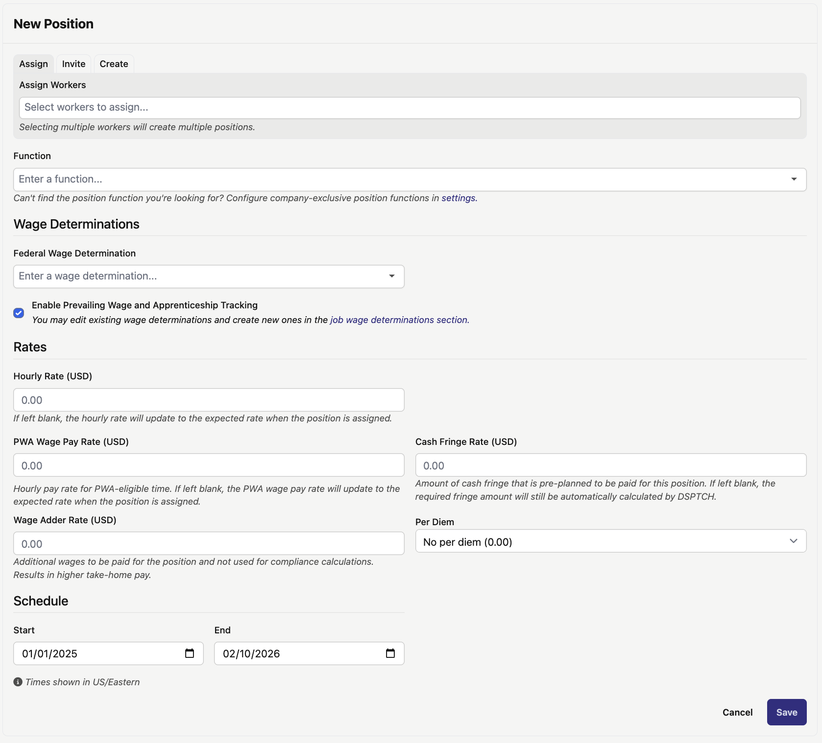 - Assign - choose names from a dropdown list that automatically assigns the selected users to the positions with the chosen settings. Multiple workers can be assigned to the same position at once (e.g. assigning multiple workers to an "ELECTRICIAN" Wage Determination).