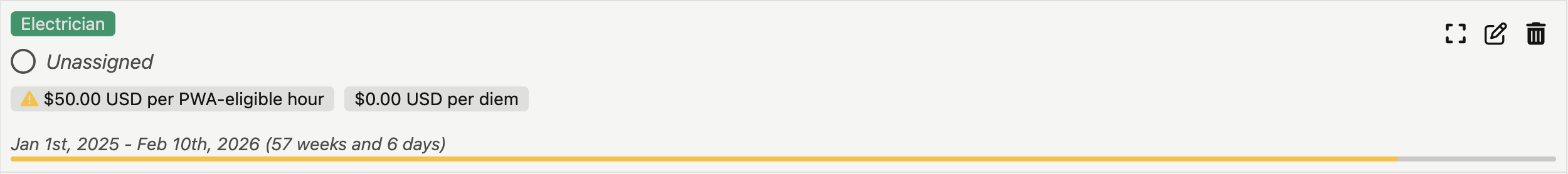 - The hourly rate for PWA-eligible time. By default, this field is filled by the PWA rate of the selected Wage Determination. If no Wage Determination is selected, then it will be blank.