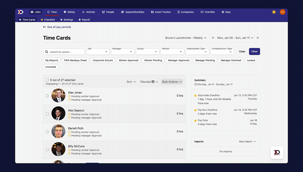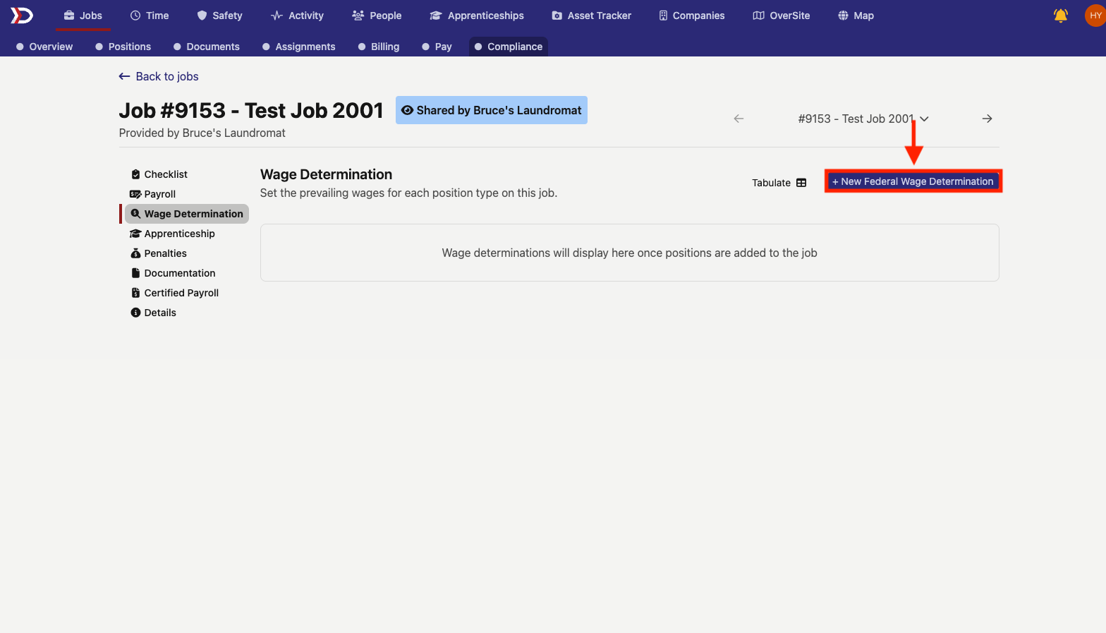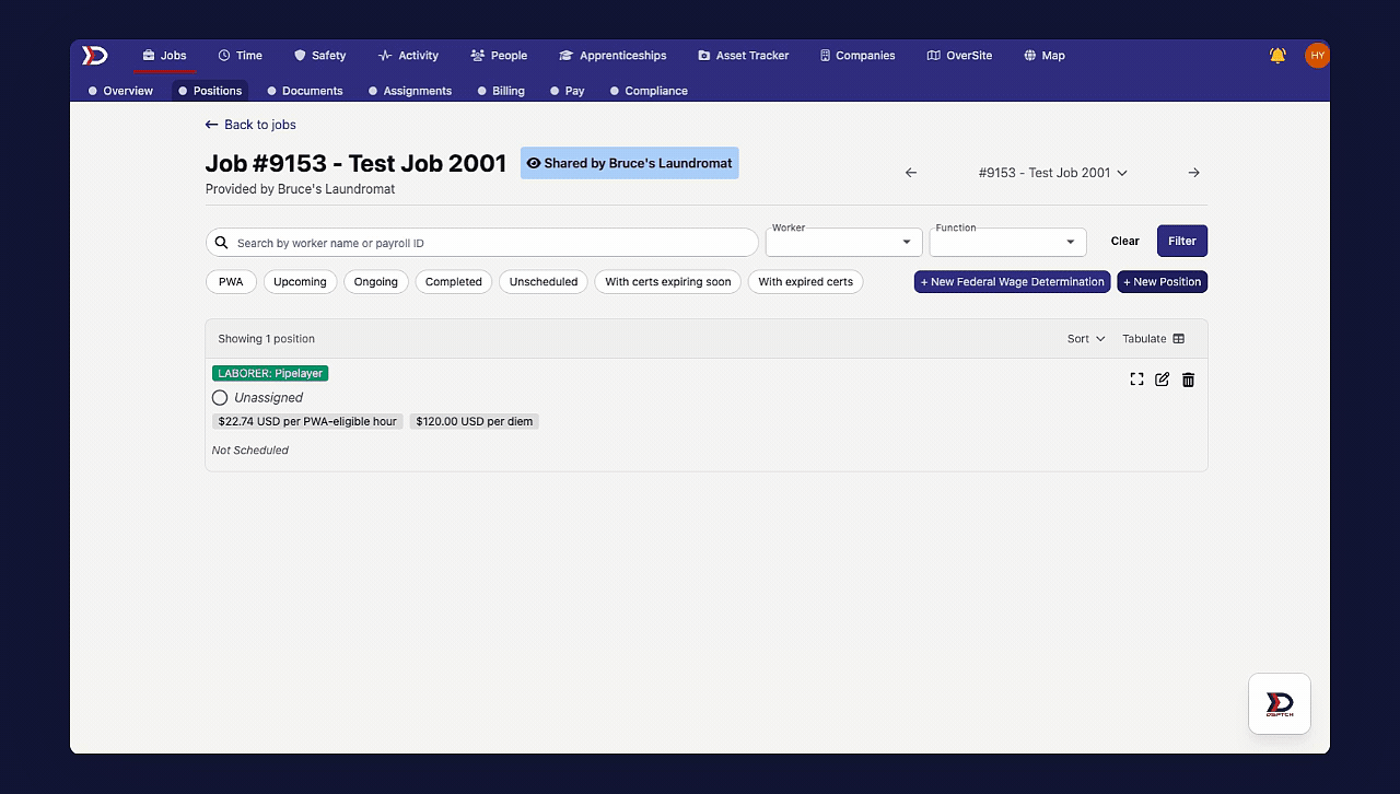 For jobs that have Prevailing Wage & Apprenticeship (PWA) tracking enabled, DSPTCH allows for the creation and assignment of wage determinations to ensure compliance with PWA standards. To learn how to enable PWA tracking, please read our Create a Job help document.