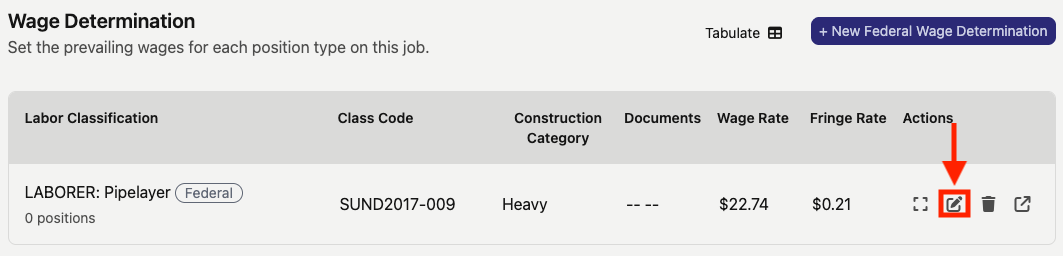 To edit a wage determination, click the pencil and paper icon near the right side (indicated by the red box and arrow in the image below).