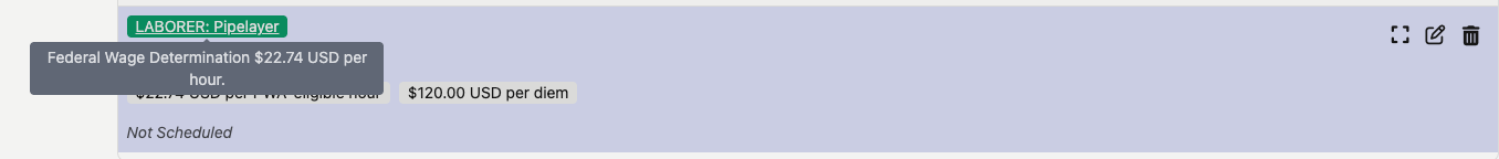 When a wage determination is applied onto a position, it will be visible as a green rectangle on the position. The wage determination rate in dollars ($) can be viewed when moused over.