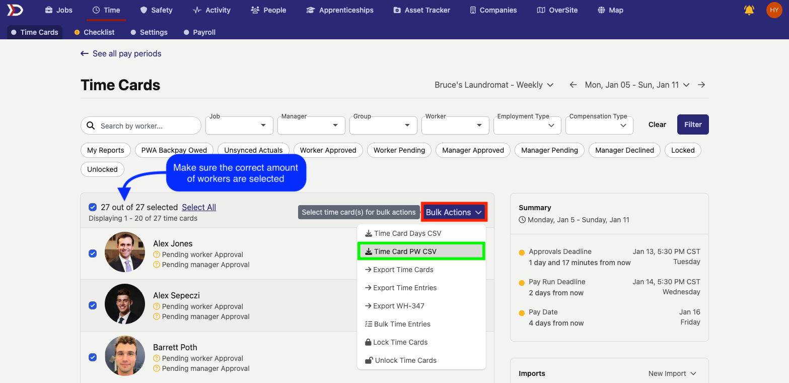 - Click "Time Card PW CSV" (indicated by the green box in the image below)