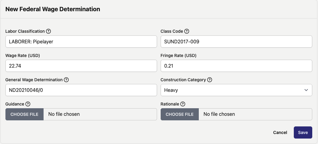 This will pull up the "Edit Federal Wage Determination" form, which is has identical fields as the "New Federal Wage Determination" form, but with the existing settings already inputted.