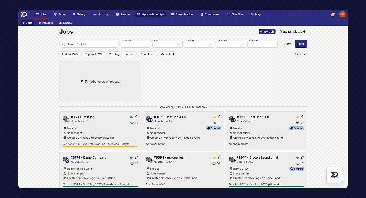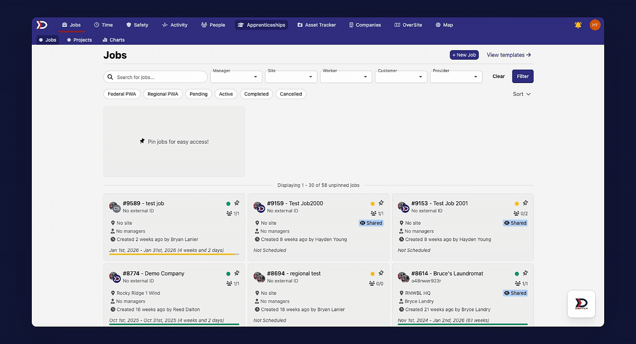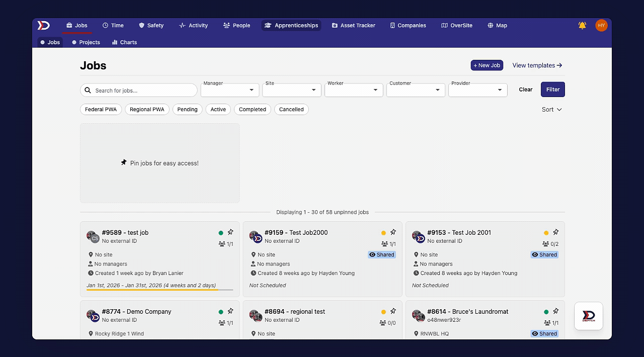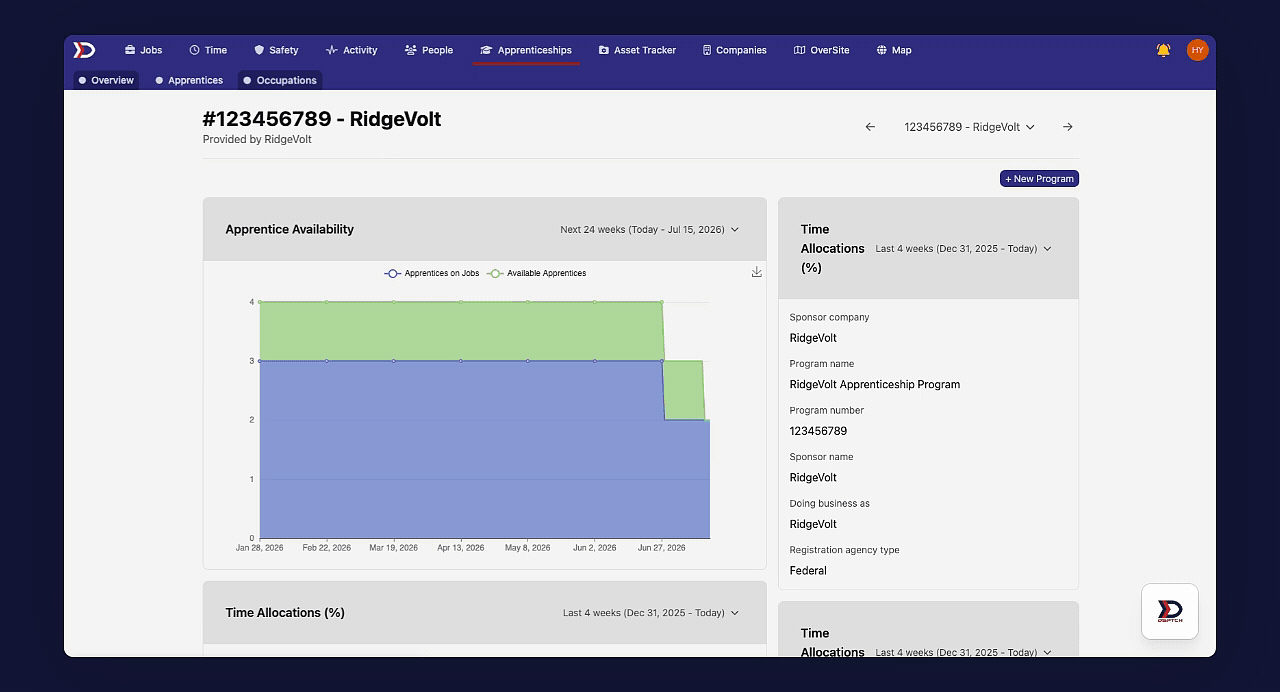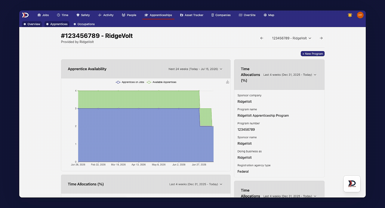Jobs that are created with the "Prevailing Wage and Apprenticeship Tracking" feature enabled provide visibility into the apprentice to journeyworker ratio and total apprentice hours % for all companies involved. To learn how to create a job with "Prevailing Wage and Apprenticeship Tracking" enabled, check out our guide here.