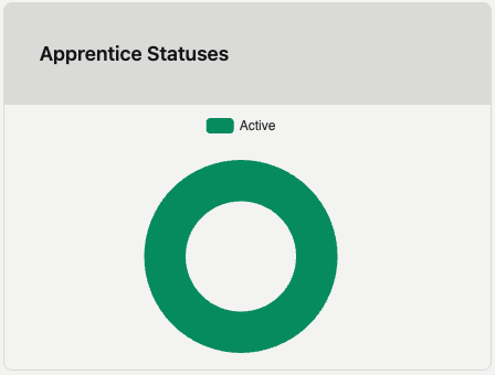 The "Apprentice Statuses Dashboard" shows the percentage of apprentices that falls into each status category. The status categories include active, cancelled, completed, denied, overdue, pending, registered, and suspended.
