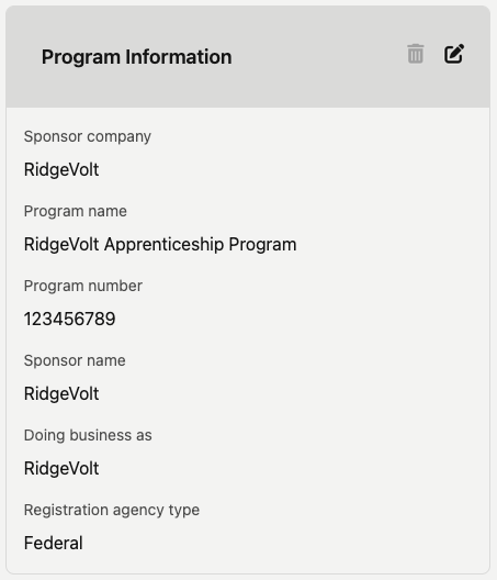 The "Program Information" dashboard contains basic info about your apprenticeship program. This includes the sponsor company's name, the apprenticeship program name, the apprenticeship program number, the official sponsor name, the doing business as name for the sponsor, and if the apprenticeship program is federal or regional.
