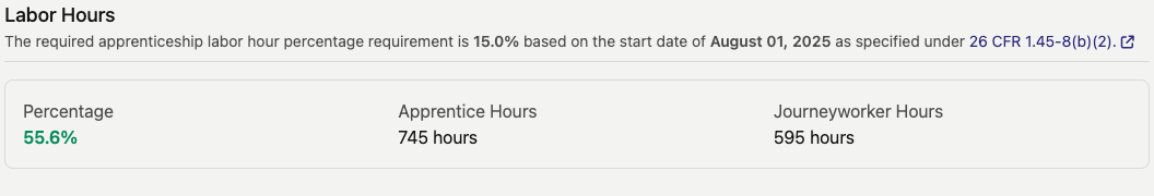The "Labor Hours" section displays the current % of hours worked by apprentices for the job, the total number of apprentice hours, and the total number of journeyworker hours.