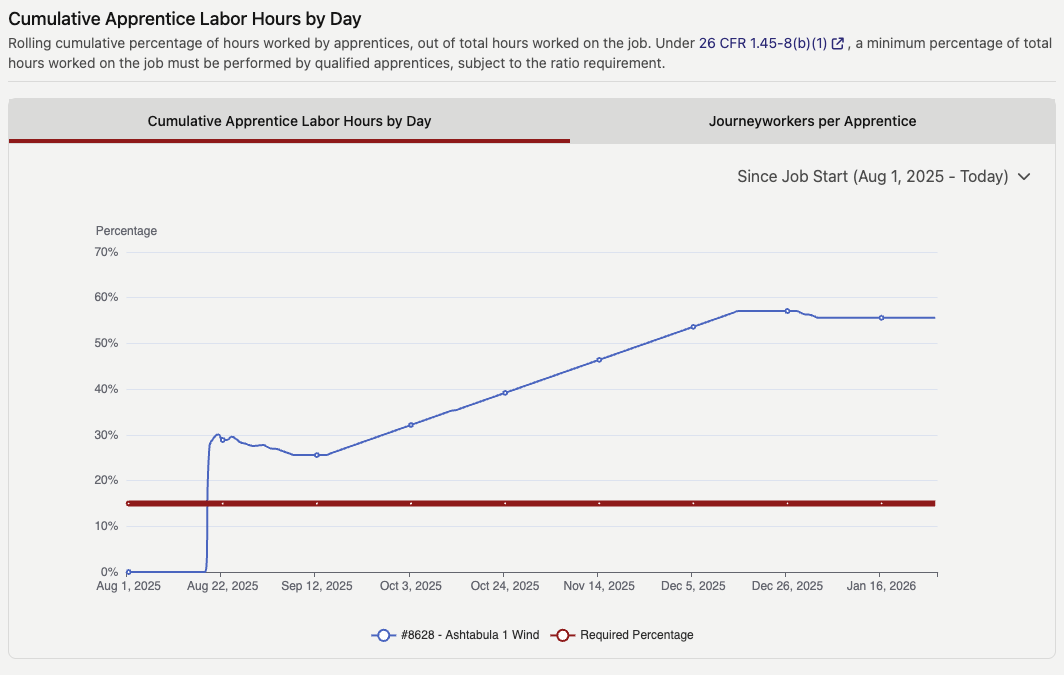 There are two graphs that display relevant apprentice information for the job. The first graph is the "Cumulative Apprentice Labor Hours by Day" graph and displays the cumulative percentage of hours worked by apprentices out of total hours on the job over time. The red line represents the minimum % of total hours required to be worked by apprentices.