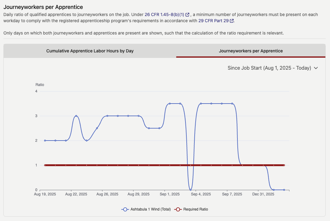 The second graph is the "Journeyworkers per Apprentice" graph and displays the daily ratio of qualified apprentices to journeyworkers on the job. To view the graph, click on the "Journeyworkers per Apprentice" tab in the section. The red line displays the minimum ratio of journeyworkers to apprentices required.