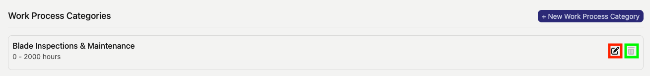 To edit an existing work process category, click the pencil and paper icon on the right side of the work process category (indicated by the red box in the image below). If the work process category needs to be deleted, click the trashcan icon (indicated by the green box in the image below).