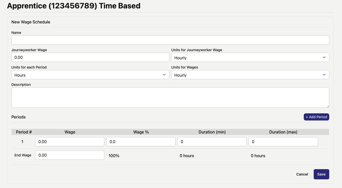 - For each period of the wage progression schedule, enter in the % of the journeyworker wage that the apprentice will earn, the min/max number of hours to progress from the period, the number of competencies to progress from the period, and an optional description.