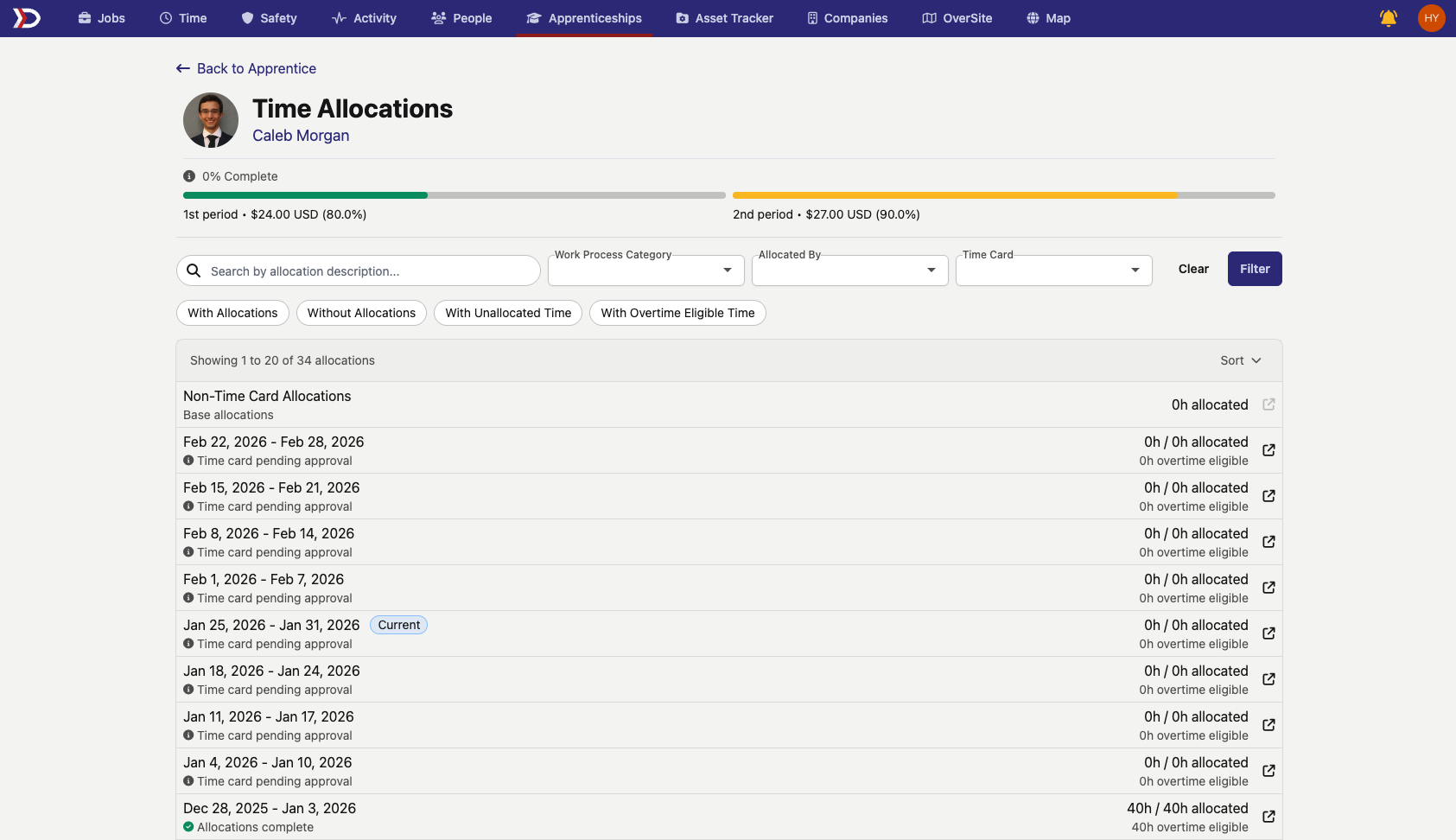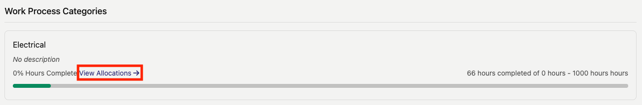 For each apprentice, there is a more granular view of their progress in each work process category that can be accessed by clicking on an apprentice's profile. There is also visibility into which time cards the hours from each work process category have been allocated from by click the "View Allocations" button (indicated by the red box in the image below).