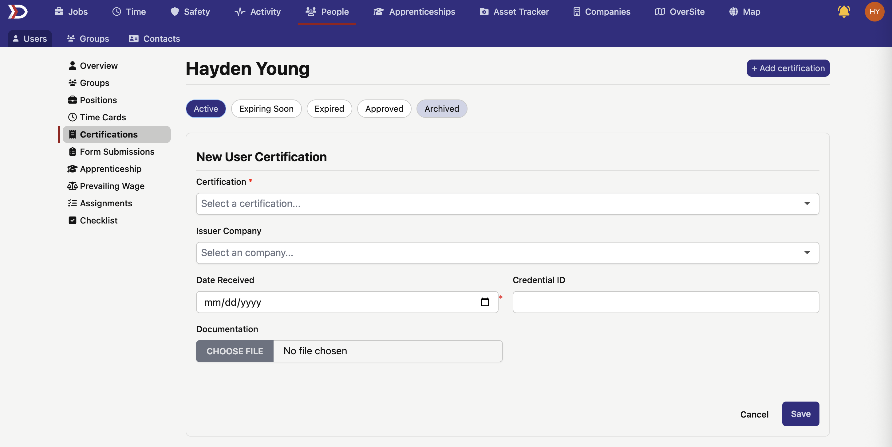 The Certifications Tab contains a list of all Active, Archived, and Expired Certifications which the User possesses. See image below for an example: