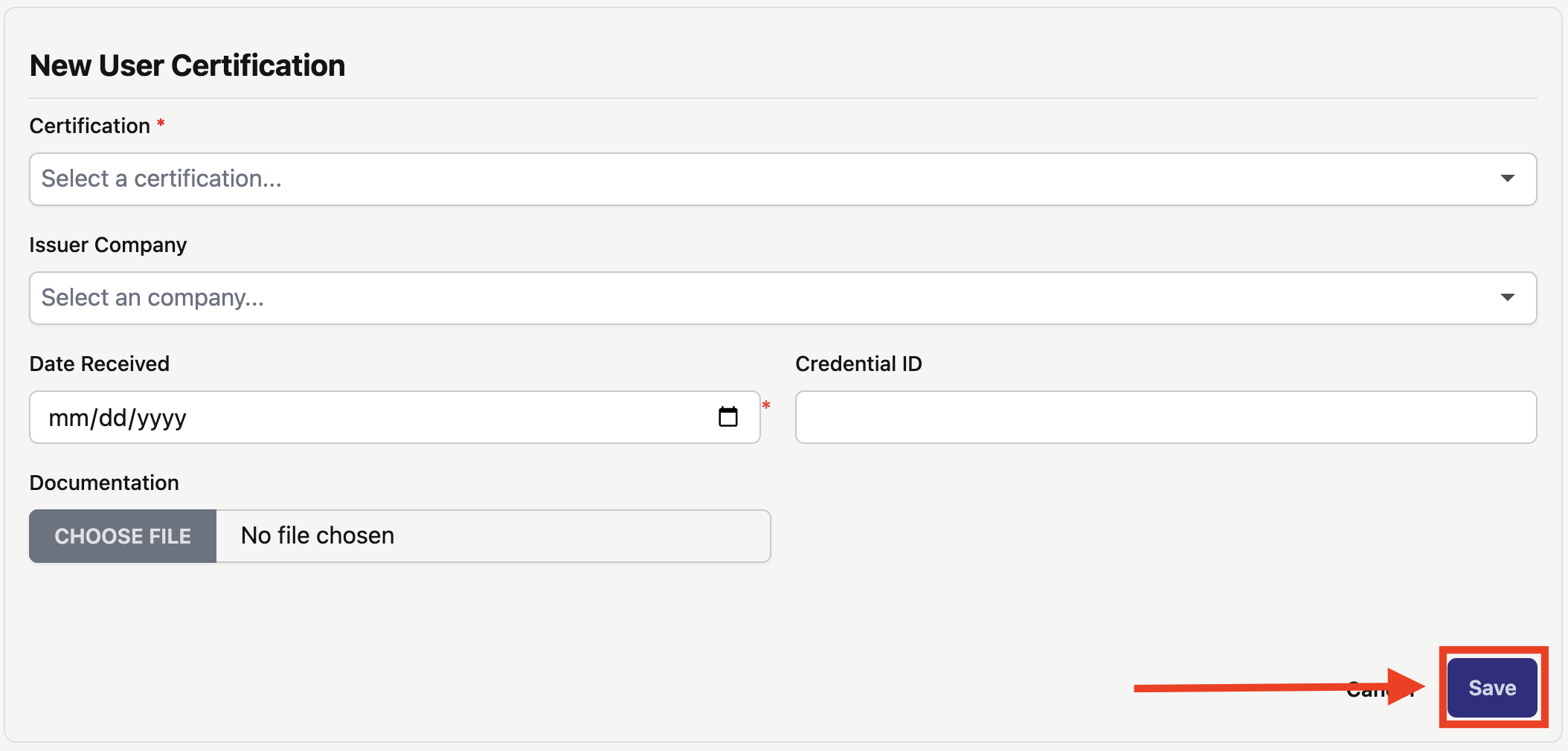 Once all fields have been filled out for the Create New Certification Form, click "Save" at the bottom right of the form (highlighted in the red box in the image below):