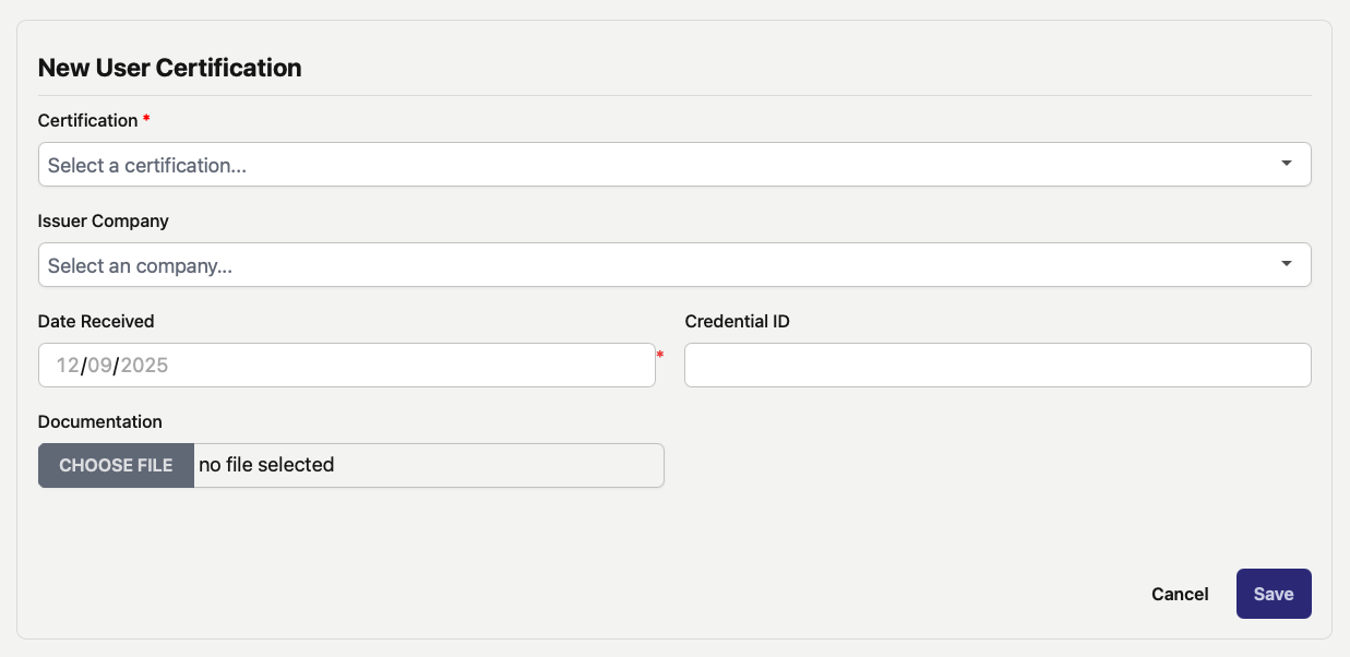 To navigate to a User's Profile Page, start by clicking the "People" tab from the main navigation bar at the top of the screen. Then search for the User by name in the search bar on the User's Page. Then, click on the User to open their Profile. Next, click the "Certifications" tab from the menu bar on the left side of the screen. Lastly, click the "+ Add Certification" button. This will open the Create New Certification Form. See the video below for a demonstration: