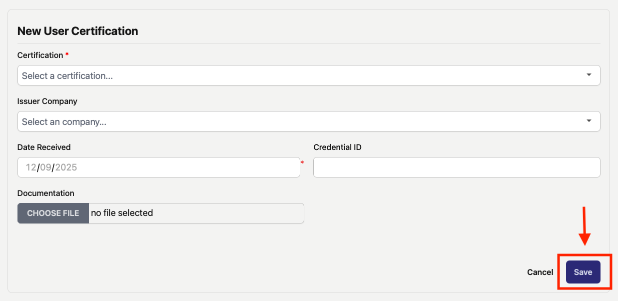 After all fields have been filled out, click the "Save" button to finish the creation of the Certification (highlighted in the red box in the image below):
