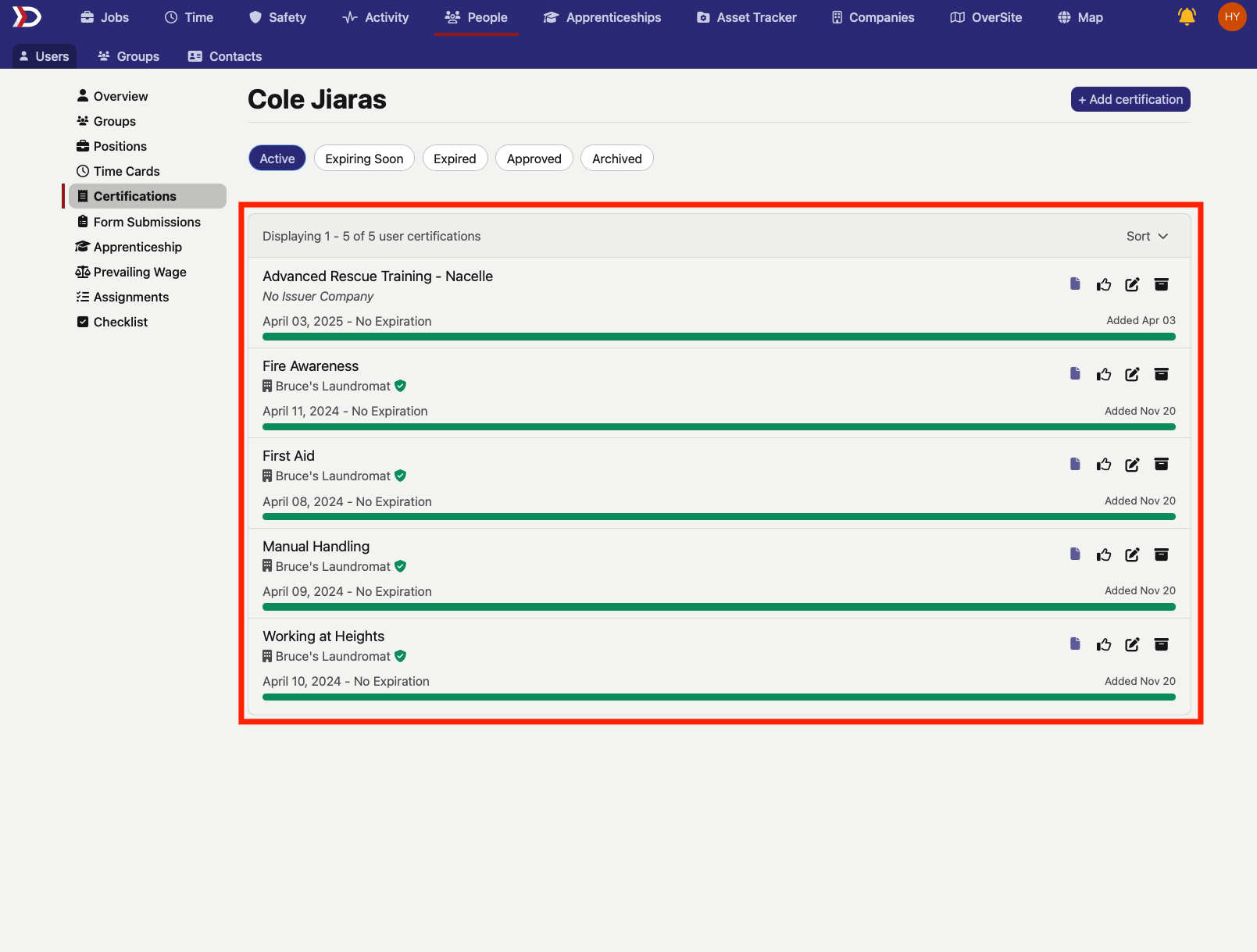Once the new Certification is created, it will appear in the Certification List on the User's Profile Page (highlighted in the red box in the image below):