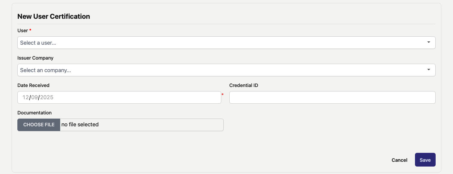 - The name of the Certification Type. This is a search bar from all existing Certification Types in your Company's Profile.