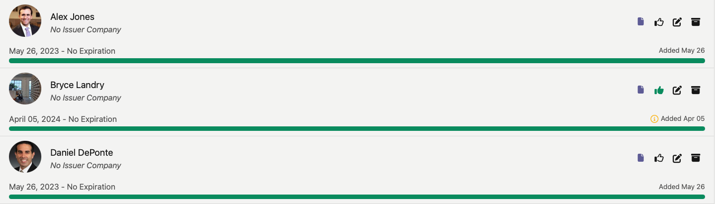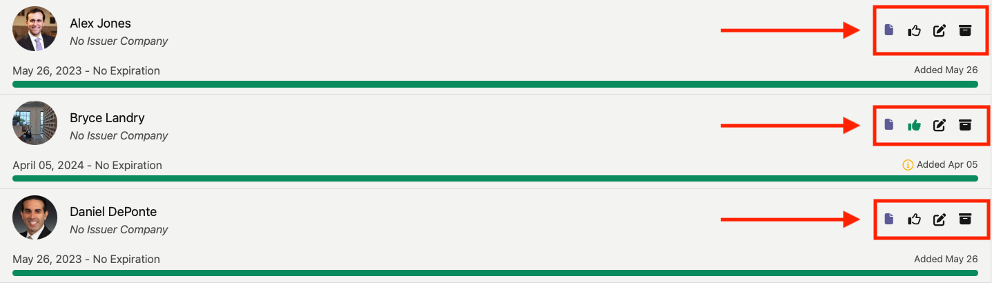 - Managers can approve a Certification by clicking the the thumbs up icon (second icon from the left)