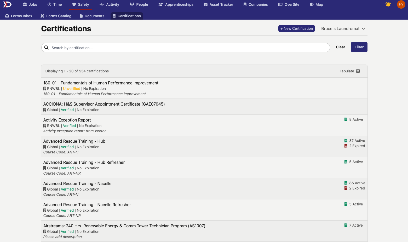 After clicking the "Save" button, the new certification type will appear in the list on the "Certifications" tab. See image below for examples of different certification types:
