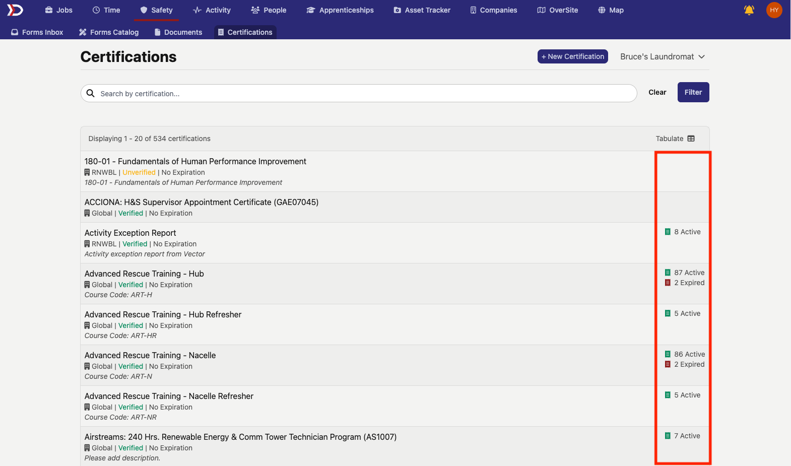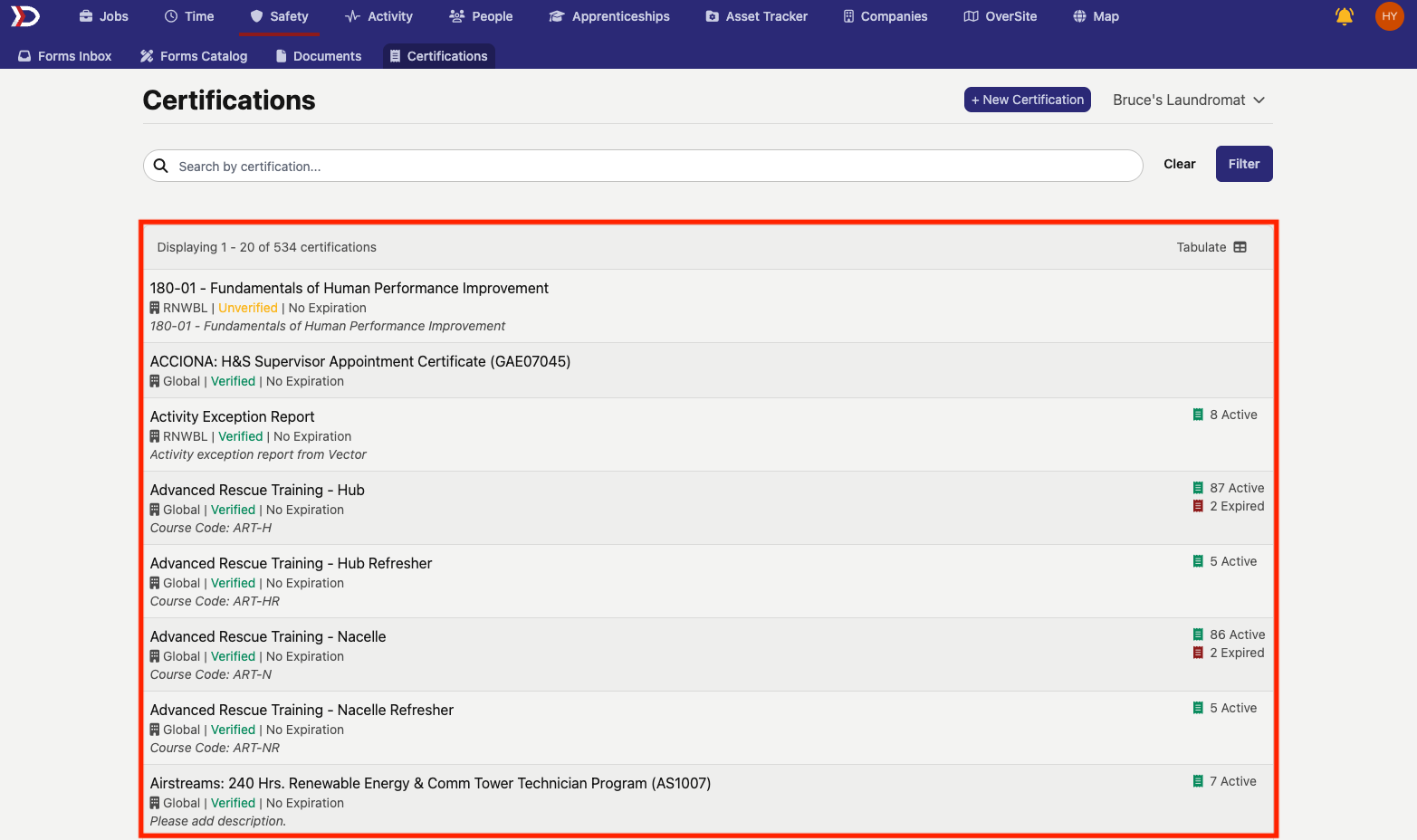 To view which users actively hold a given certification, click on the name of the certification. This will open the certification's page. The certification's page contains a list of all users that actively hold the certification as well as those with expired, expiring soon, and archived certifications (see image below for example):