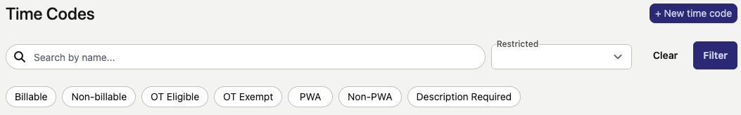 At the top of the "Time Codes" page, there are several filter options. There is an option to search for time codes by name or filter by their classification status (see above for a detailed explanation on classification statuses).