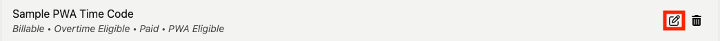 All time codes are editable at any time. To edit a time code, click the pencil icon to the right of the time code's name (indicated by the red box in the image below. This will open the "Edit Time Code" form, which contains the same fields as the "New Time Code" form. All fields are editable. For a detailed breakdown of each field, please see the list in the How to Create a New Time Code Section above.
