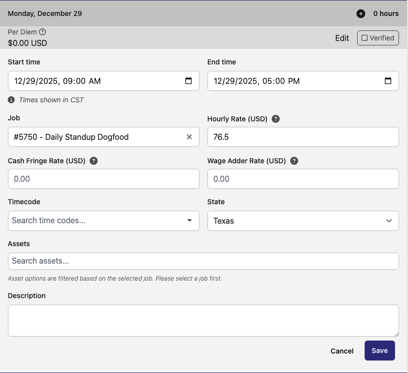 Then, fill in information such as the start/end time, job, hourly rate, timecode, state (location), assets worked on, and a description. Lastly, click the "Save" button. The time entry will now appear in the user's time card.