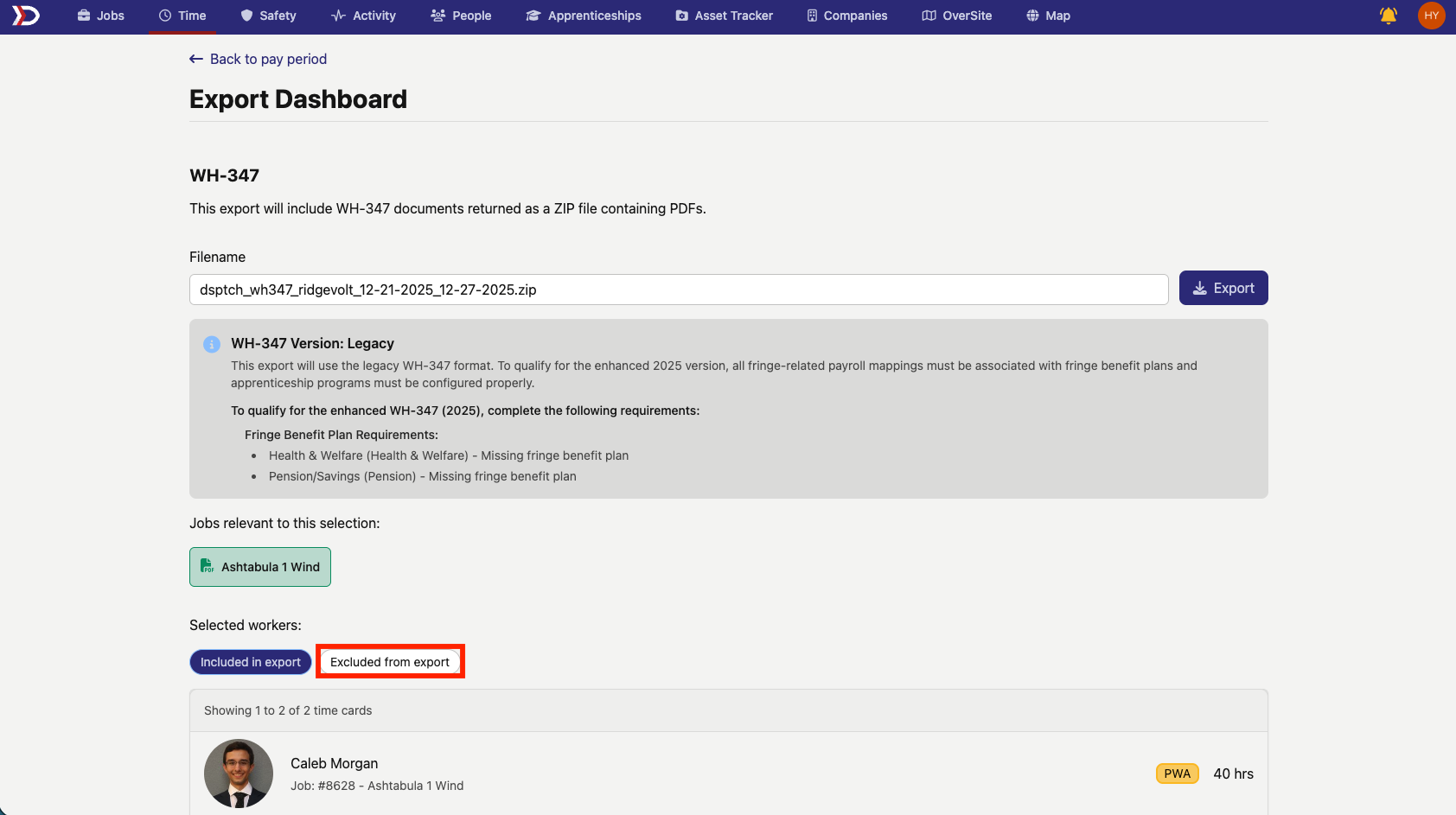 The excluded from export view also provides the rationale as to why a user cannot be included in the WH-347 export (i.e. they did not work on any PWA jobs during the pay period).