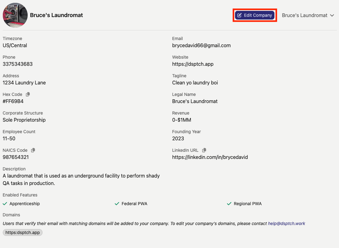 The basic company details section contains all the basic information about your company that will be publicly visible on DSPTCH. To edit the details in this section, click on the "Edit Company" button (indicated by the red box in the image below).