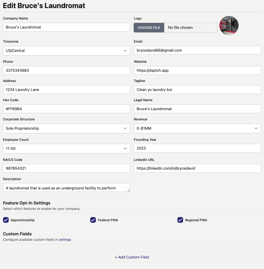 This will open the "Edit Company" form, pictured below. There are several fields for this section within this form: