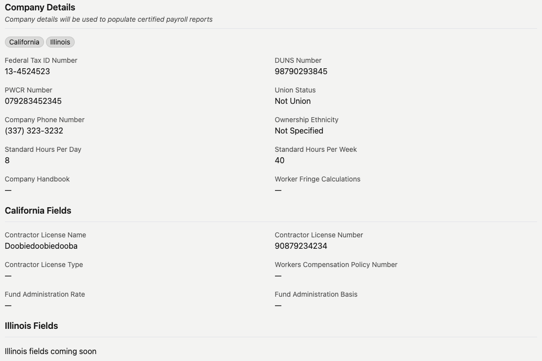 The details in this section can be edited by clicking the "Edit Company" button near the top of the page.