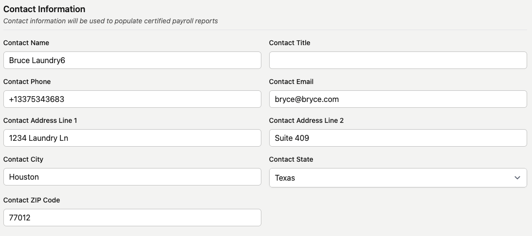 The "Contact Information" section contains required contact information fields used to populate certified payroll reports generated by DSPTCH.