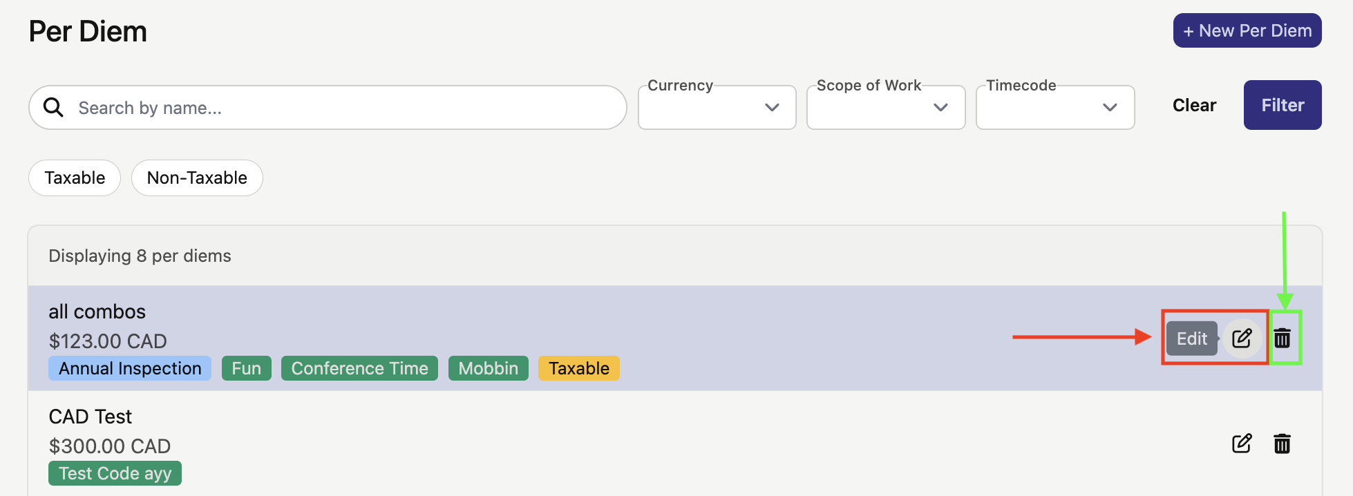 After saving a newly created Per Diem, existing Per Diems will appear in a list on the Per Diem page.