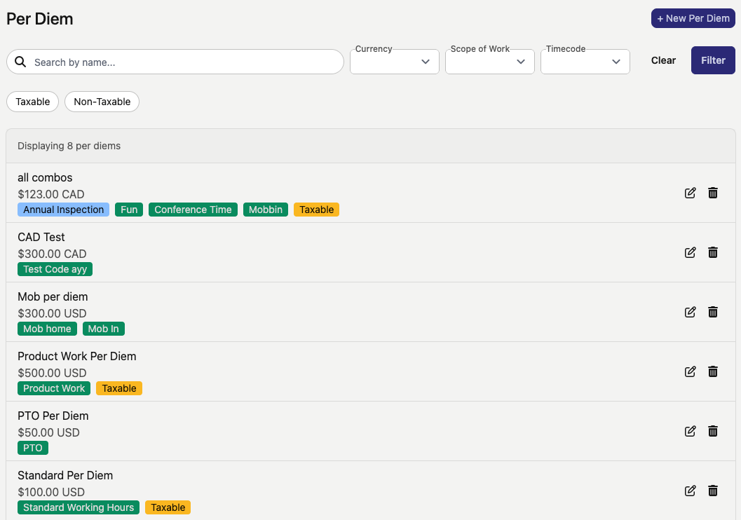 After saving a newly created per diem, existing per diems will appear in a list on the per diem page.
