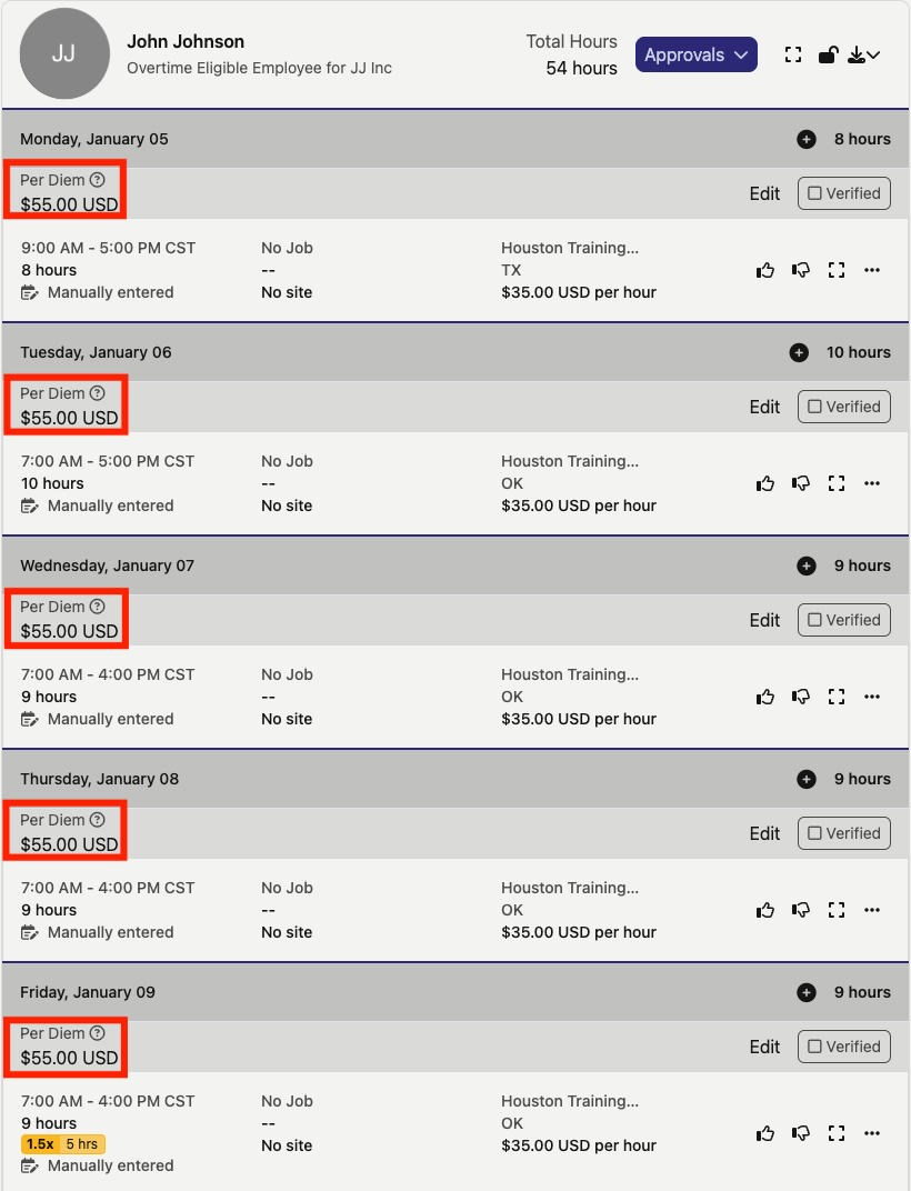 Per diems appear on the "Time Card" page of specific workers (indicated by the red boxes in the image below) and in time exports.