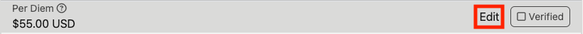 The amount that is applied to each day depends upon the scope of work of the job, and the time code on the time entry. Per diem's can be manually overridden as well by clicking the "Edit" button to the right (indicated by the red box in the image below). The available options for per diem will be the ones you have created.