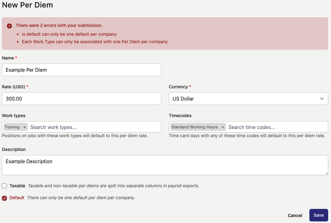 - Only one per diem may be default. Attempting to make more than one per diem the default will result in an error and prevent updating to the current Per Diem.