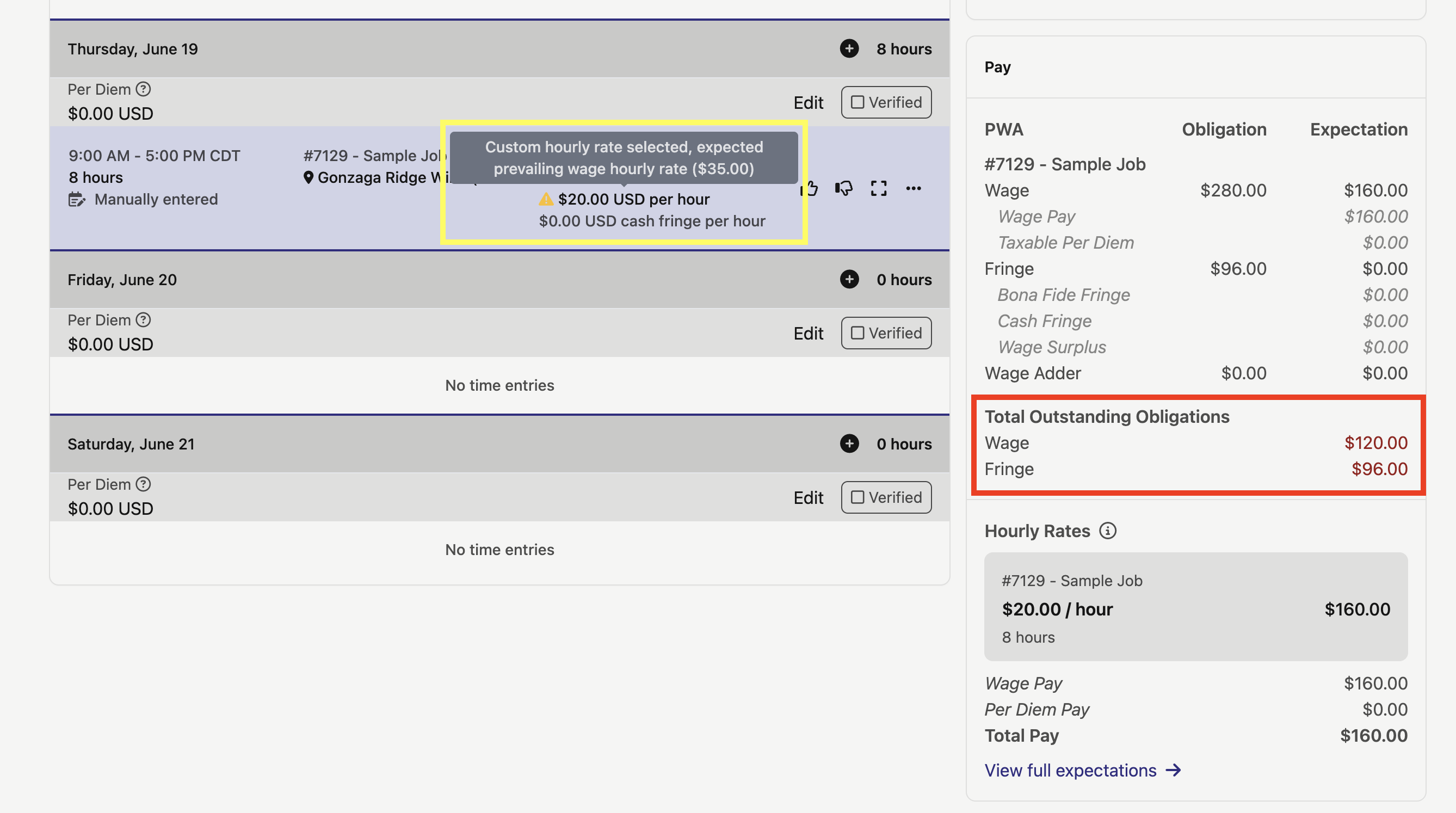 This will open the User's Time Card. Scroll down to the “Pay” section on the right-hand side to view the wage and fringe benefits calculations based on the hours from the Time Entry and the prevailing wage rate set in the Sample Wage Determination.