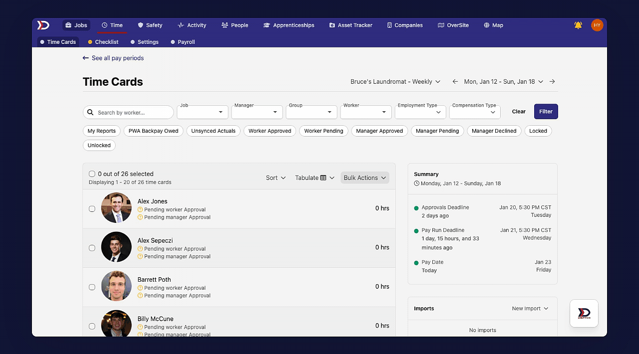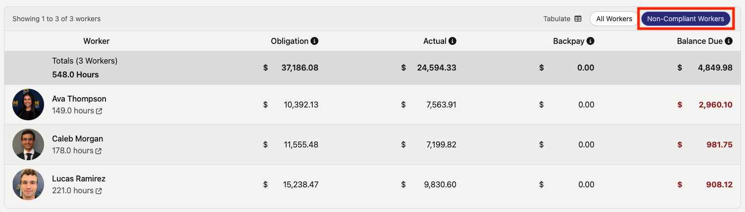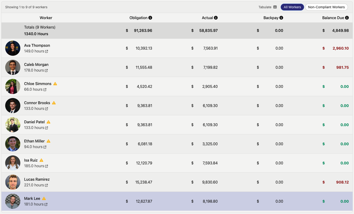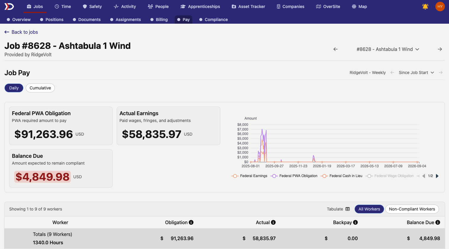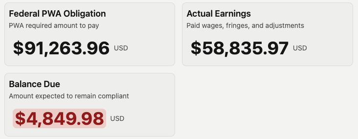 The Worker Payment Breakdown dashboard shows the PWA obligation, actual earnings, backpay adjustments, and balance due amounts for each worker on the job (pictured below).