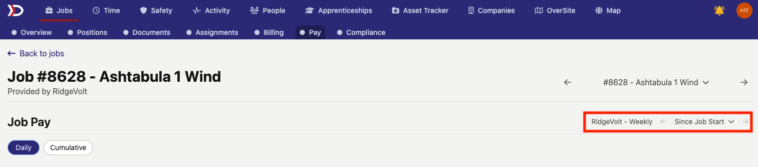 The "Daily" and "Cumulative" toggles at the top of the "Pay" tab (indicated by the red box in the image below) change the data displayed on the Graph Representation Dashboard.