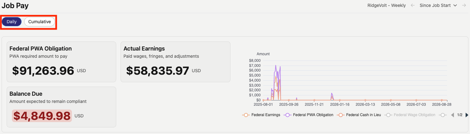 The "Cumulative" view shows how the total total PWA obligation, combined earnings, and cash in lieu of fringe for all workers on the job accrue across time.