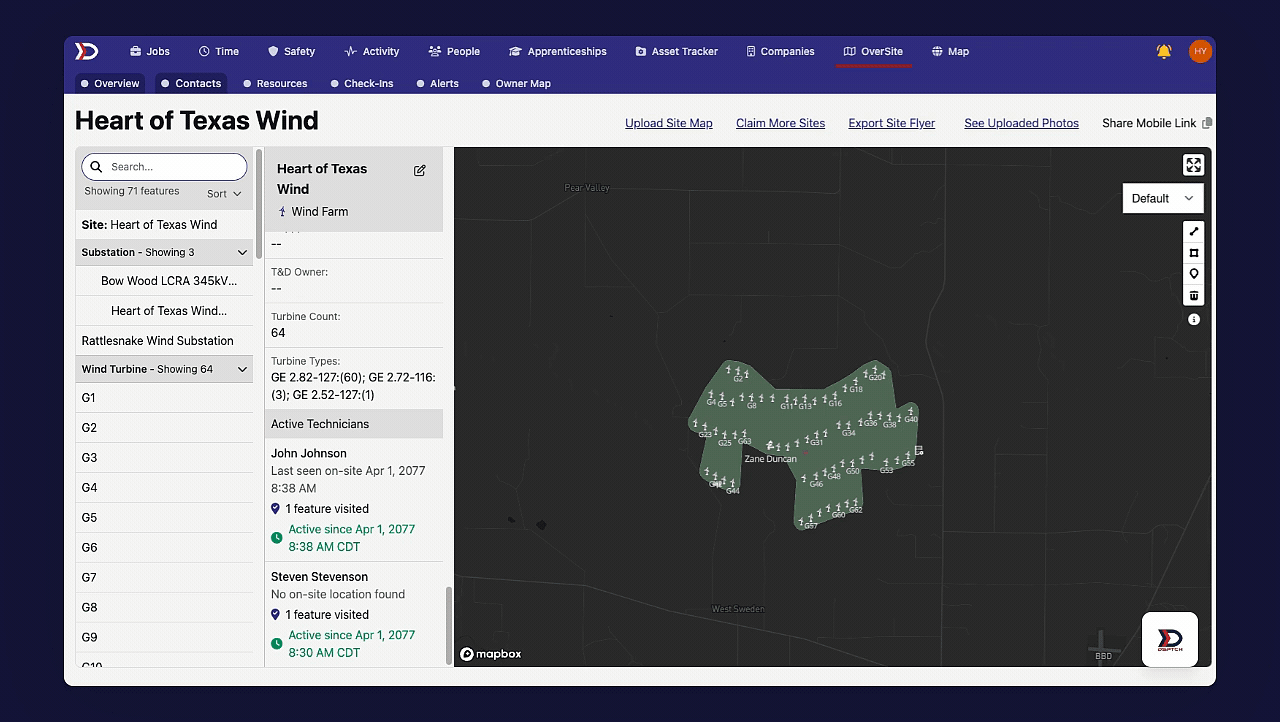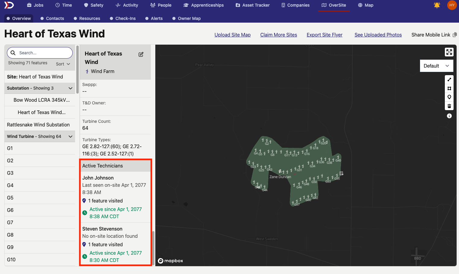 Lastly, the "Overview" tab also provides a list of all technicians that have checked in to the site (indicated by the red box in the image below).