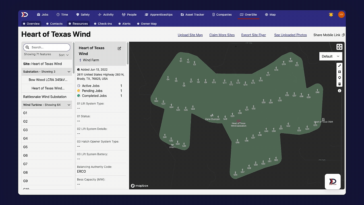 This will open the "Overview" tab, which displays a site map showing the real-time geolocation of all technicians currently on site.