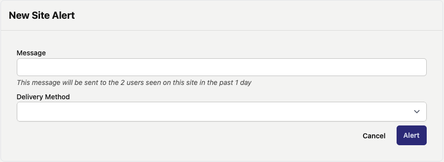 The "Alerts" tab allows site managers to send emergency alerts to all technicians on site. The list on the page will show a log of all past alerts and the manager who sent them. To create an Alert, click the "+ New Site Alert" button at the top right of the page to open the "New Site Alert" form
