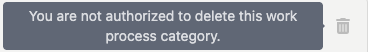 In the event that the trash can icon button is grayed out and the text "You do not have permission to delete this work process category," there are two possible problems: