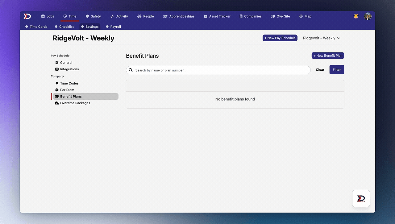 To navigate to the Employee Benefits Plan Page, first navigate to the "Time" page from the main navigation bar at the top of the screen. Then, select "Settings" from the sub-navigation bar. Next, click "Employee Benefits Plan" on the lefthand menu bar (see the video below for a demonstration):