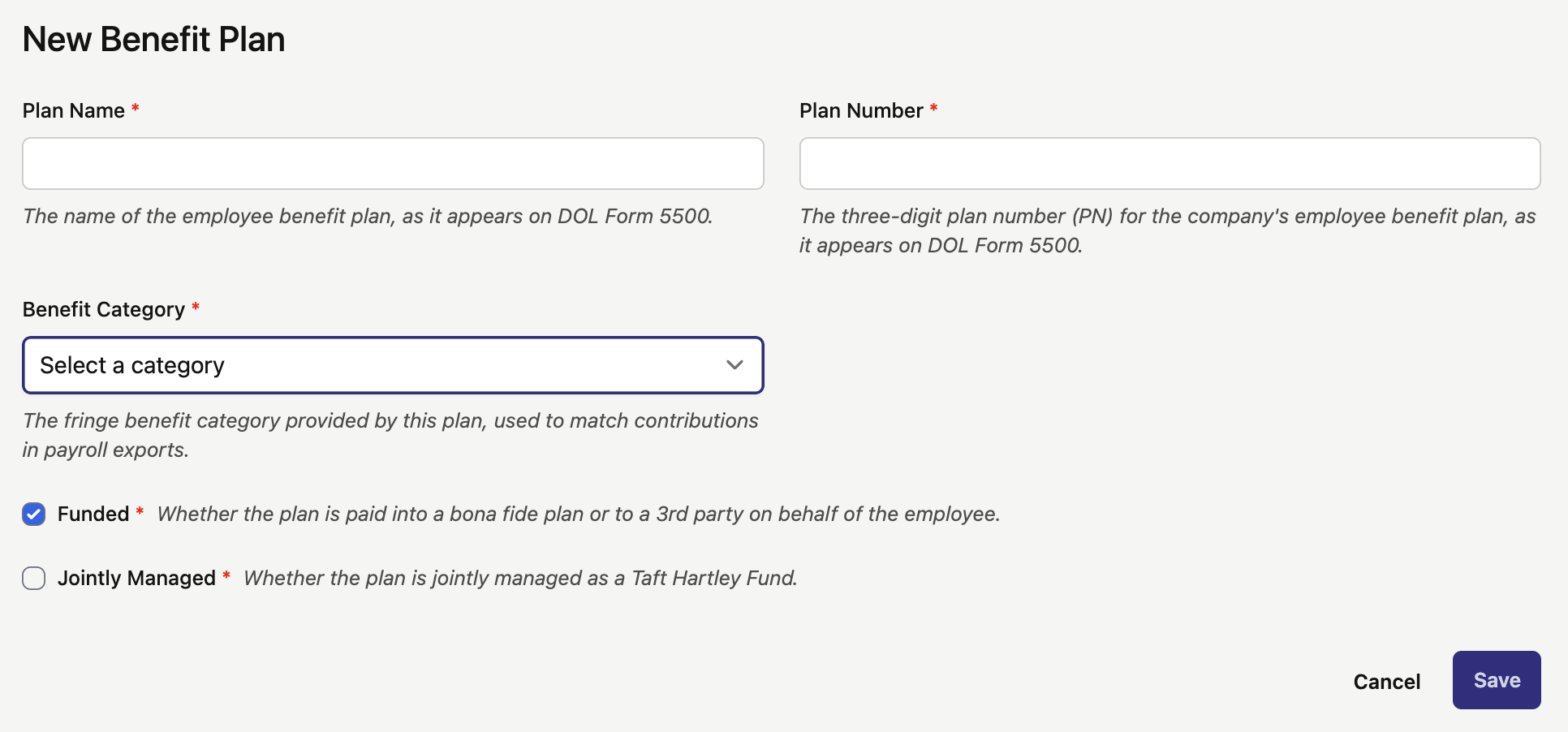 From the Employee Benefits Page, click the "+ New Benefits Plan" Button. This will open the New Benefits Plan Form (pictured below).